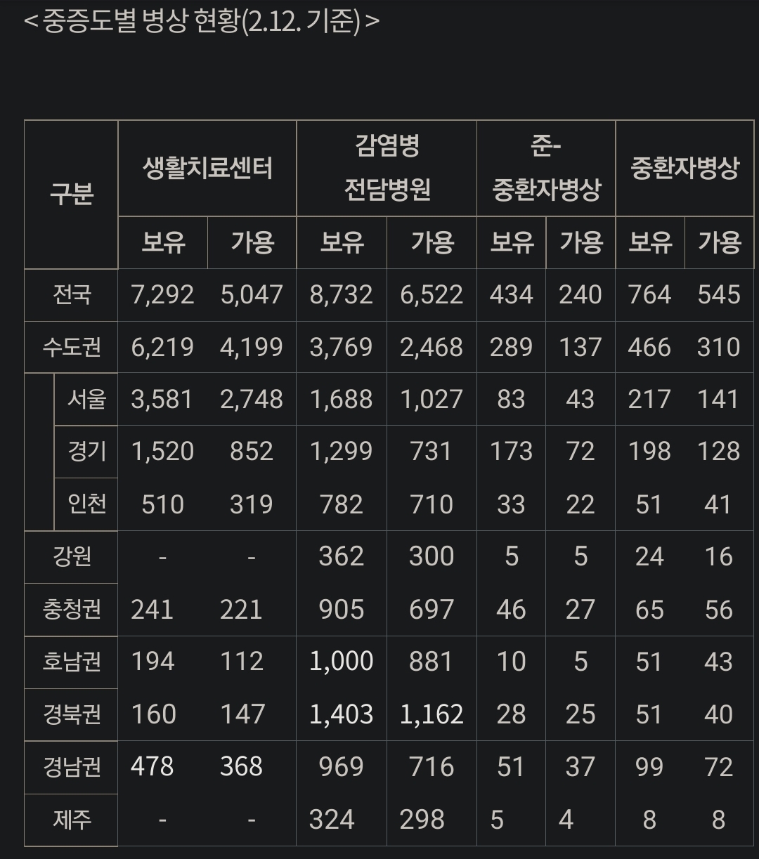 일간 환자수 차트는 셋 중 어디서도 서비스하지 않습니다. 다만 정부 일간발표에는 중환자실 일반병상 및 생활치료센터 수용 여유표가 나옵니다.