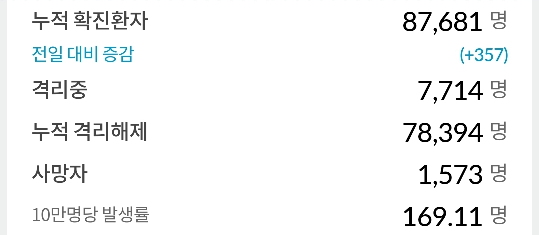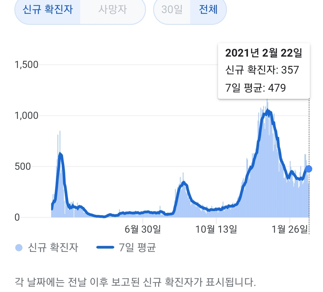 주간 평균은 아직 479명. 정부가 거리두기조치를 변경하는 기준으로 삼는 수치가 아마 최근 7일 평균이던가 그랬을 겁니다. (강화할 때도 풀 때도 꼭 그것만 기준삼지는 않습니다. 경제문제때문에 3단계를 끝까지 거부할 때도, 재감염지수던가 뭐라던가 그게 아직 1을 넘어 추이를 봐야 한다는 요즘도)