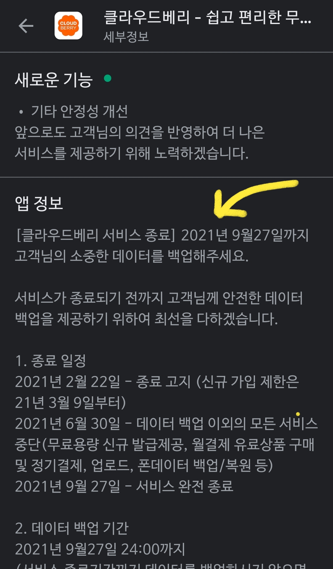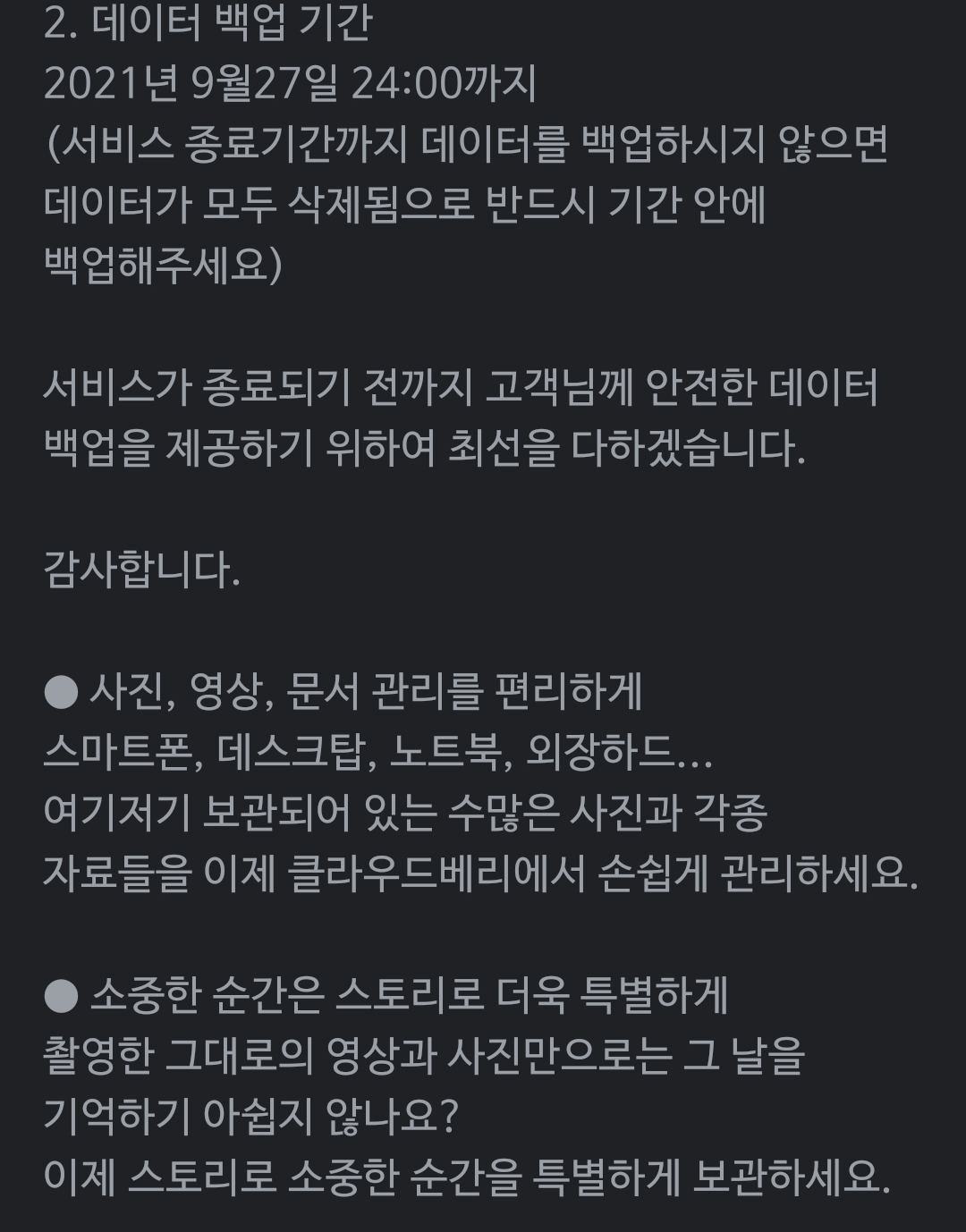 SKT 클라우드베리 서비스 종료 공지 본문