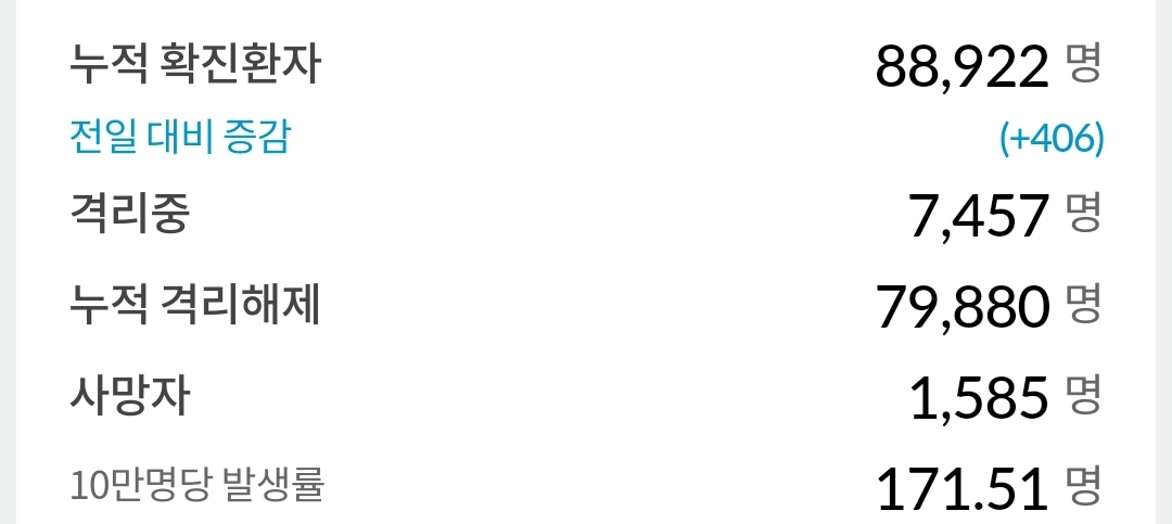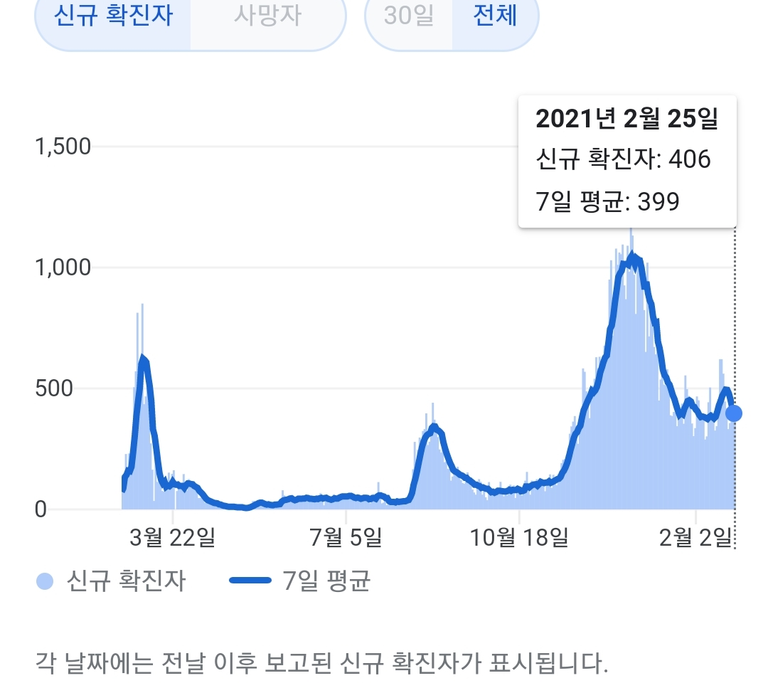 어제발표 393명으로 내려갔다가, 오늘발표 406명입니다. 최근 7일 평군은 구글 계산으로 399명이군요. 400명은 안 됐는데.. 그래서 이대로 가는 듯.