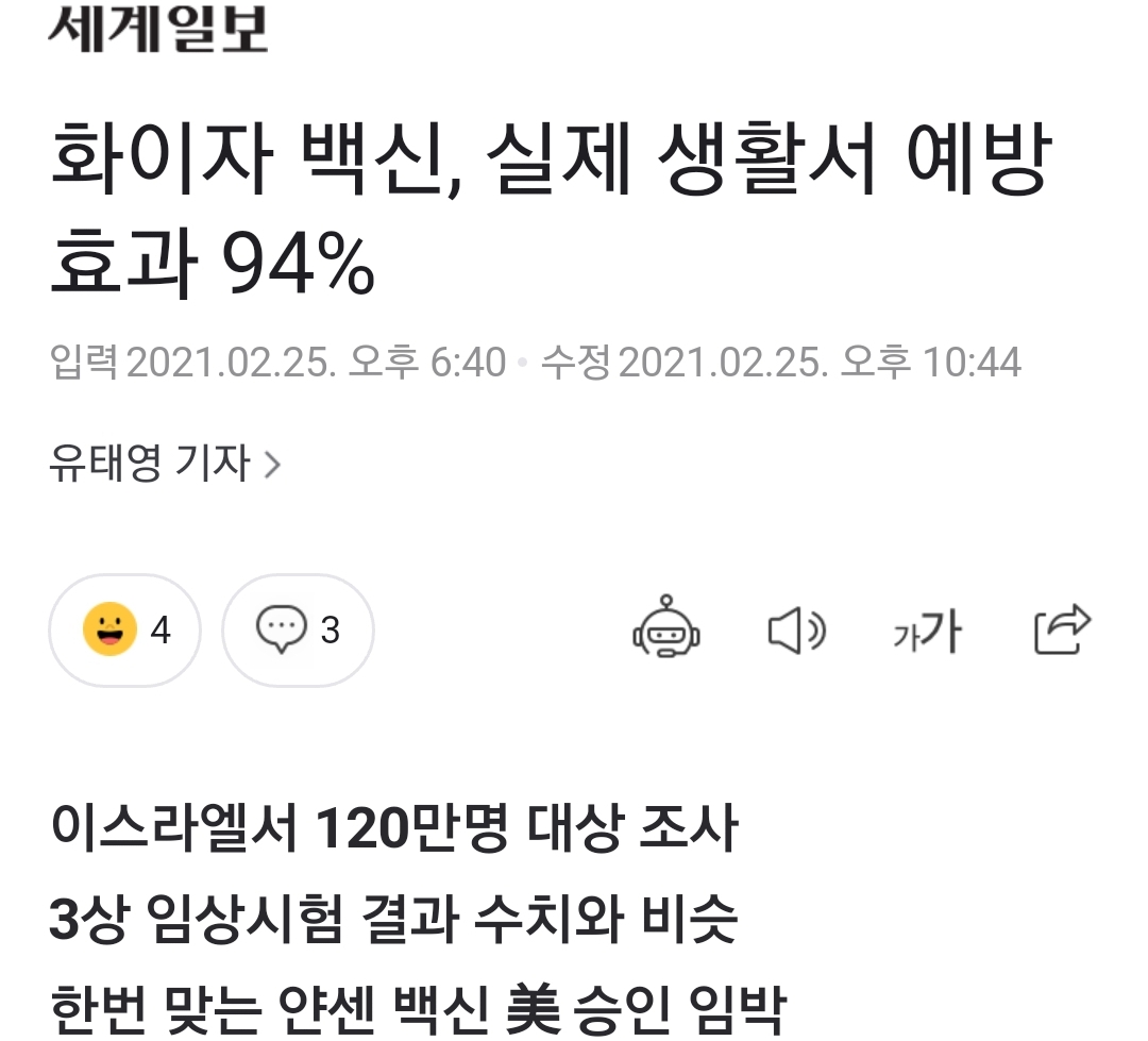 이스라엘의 화이자백신 효과 조사결과, NEJM에 퍼블리시.