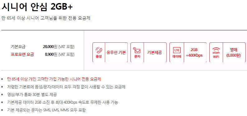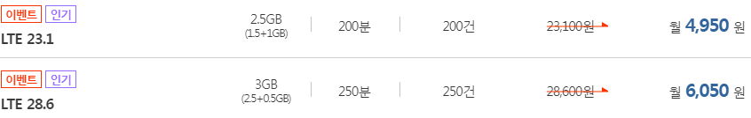 여기는 데이터 400kbps QoS, 데이터 1Mbps QoS, 음성문자무제한을 조합한 요금제가 많습니다. QoS가 걸리면 답답하기 때문에, 그 전에 제공되는 데이터량에 차등을 두어 요금제를 다시 세분화했습니다(링크 참조).