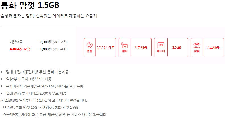 데이터 1.5GB + 통화, 문자 무제한