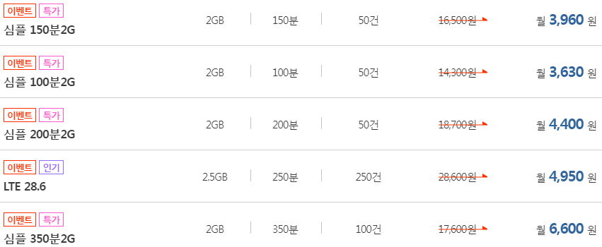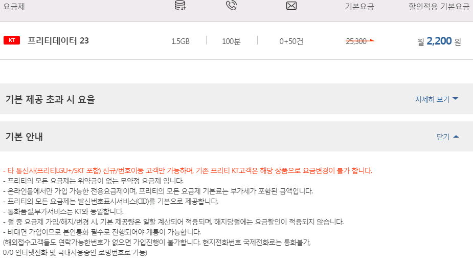 통화량 100~350분, 데이터 2~3GB정도에서 월 3~6천원 사이 요금제입니다. 자기 월 사용량을 잘 알면 이런 요금제도 좋습니다(부가통화 30분 제한에도 걸리지 않고 총통화내에서 해결되기도 하고). 가끔 한 달만 통화량이나 데이터 이용량이 확 늘게 될 것 같으면, 그 달의 1일에 통화량 +50~1510분이나 데이터 +500MB~2GB라는 식으로 추가하는 유료 부가서비스를 신청하면 도움이 됩니다. 그걸 안 주는 통신사도 있는데, 프리텔레콤은 그 부가서비스가 있어요. 다만, 월중에 신청하면 요금이 일할부과되는 대신 제공량도 일할계산해 줄어들기 때문에, 월초에 신청하는 게 유리합니다. 아래 링크 참고: