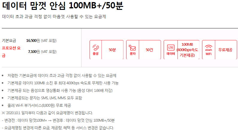 데이터 맘껏 안심 100MB+/50분
