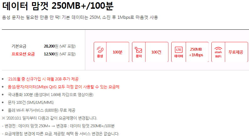데이터 맘껏 250MB+/100분