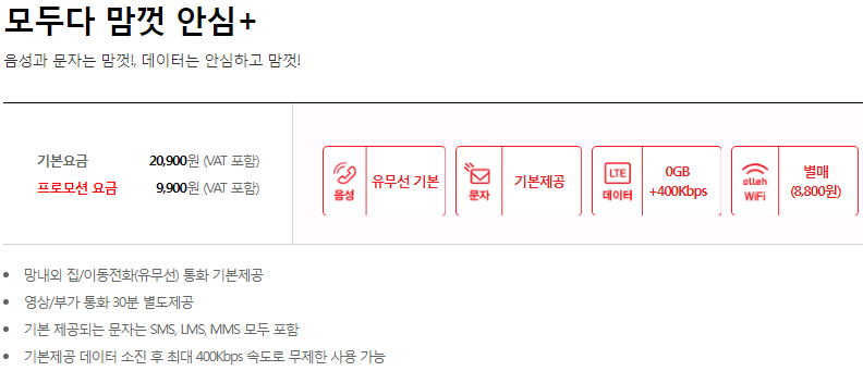 데이터 400kbps QoS + 통화 50분 문자 50건
