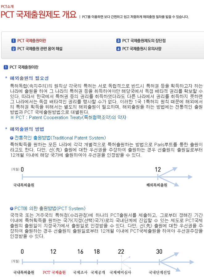 전통적인 방식이나 PCT방식이나, 국내특허출원 후 12개월 안에 진행해야 하는 것은 같다. 다만 각 국가별로 출원하기를 반복할 필요가 없어 훨씬 간단해졌다는 것.