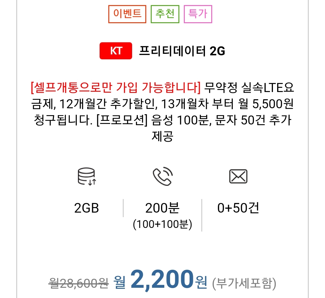 음성통화데이터 사용량이 모두 적은 사람용으로, 월기본료를 가능한 한 줄인다는 컨셉. 이 아이디어에 맞다면 괜찮고, 아무리 그래도 이건 넘는다싶으면1 kt엠모바일이나 다른 통신사, 이를테면 프리텔레콤의 저렴이요금제나 알뜰폰허브사이트에서 조건을 주어 검색할 수 있는 요금제 중에 월 데이터 기본제공량이 1~2기가 이상이거나 월 통화량 기본제공량량이 더 많은 걸 알아볼 수 있습니다. 당장, 이 글을 발행하고 나니 글에 붙은 광고칸에 더 싼 요금제광고가 붙네요. ㅎㅎ