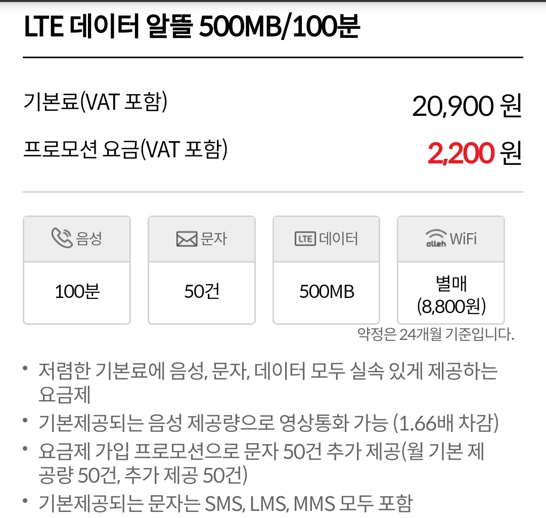 LTE 데이터 알뜰 500MB/100분