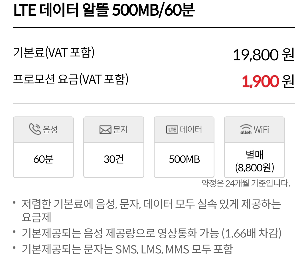 LTE 데이터 알뜰 500MB/60분