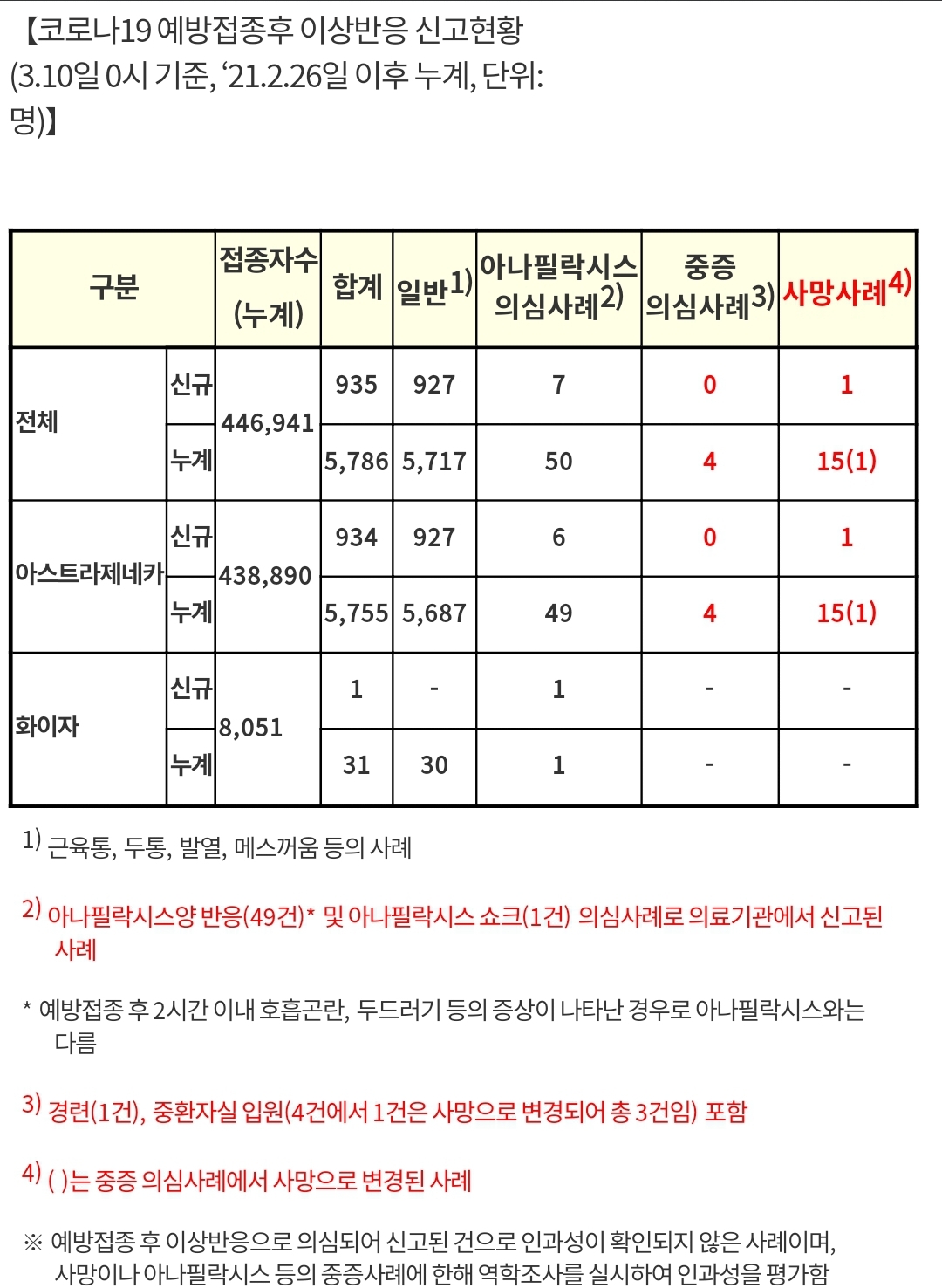 백신접종하고 죽은 사람은 누적 15명입니다. 의료계에서는 정부의 접종 대상이라도 자기가 병이 있으면 이번에는 맞지 않는 게 나을 수 있다는 얘기가 조금씩 나오고 있습니다. 정리하면,