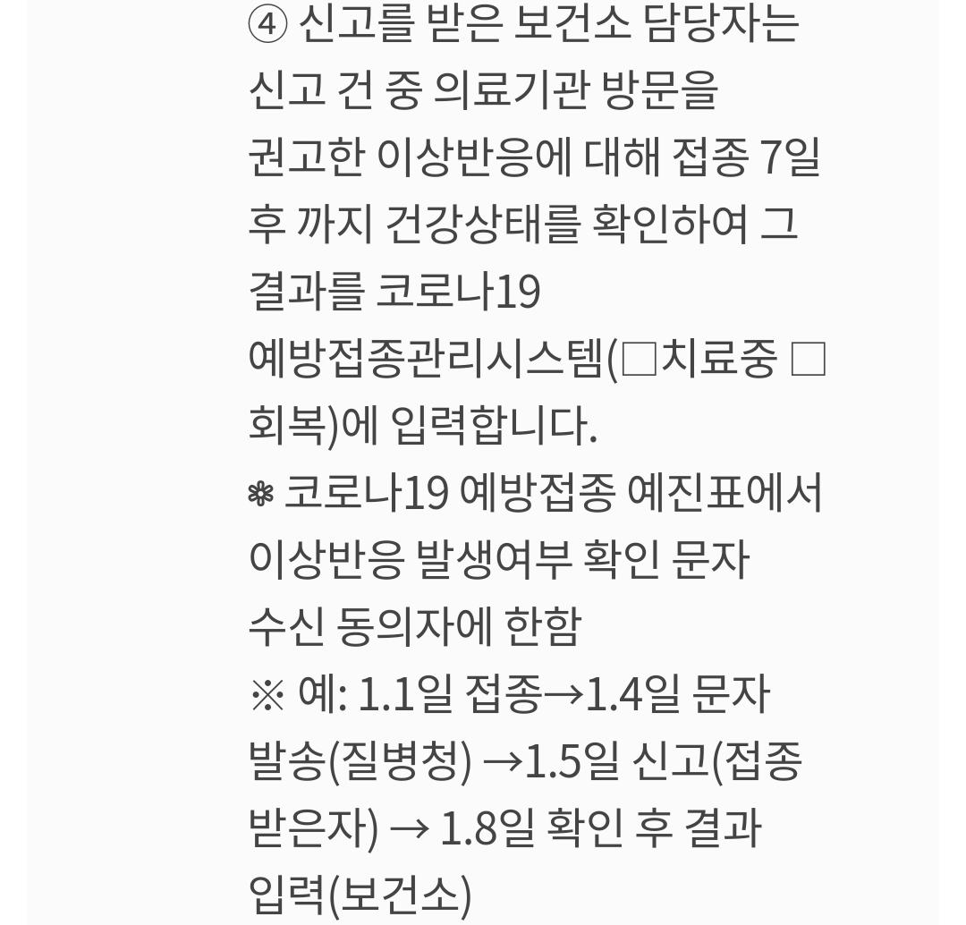 ㅡ 접종 3일 후 질병관리청에서 부작용 여부를 묻는 설문 문자를 보낸다. 꼭 회신하자.