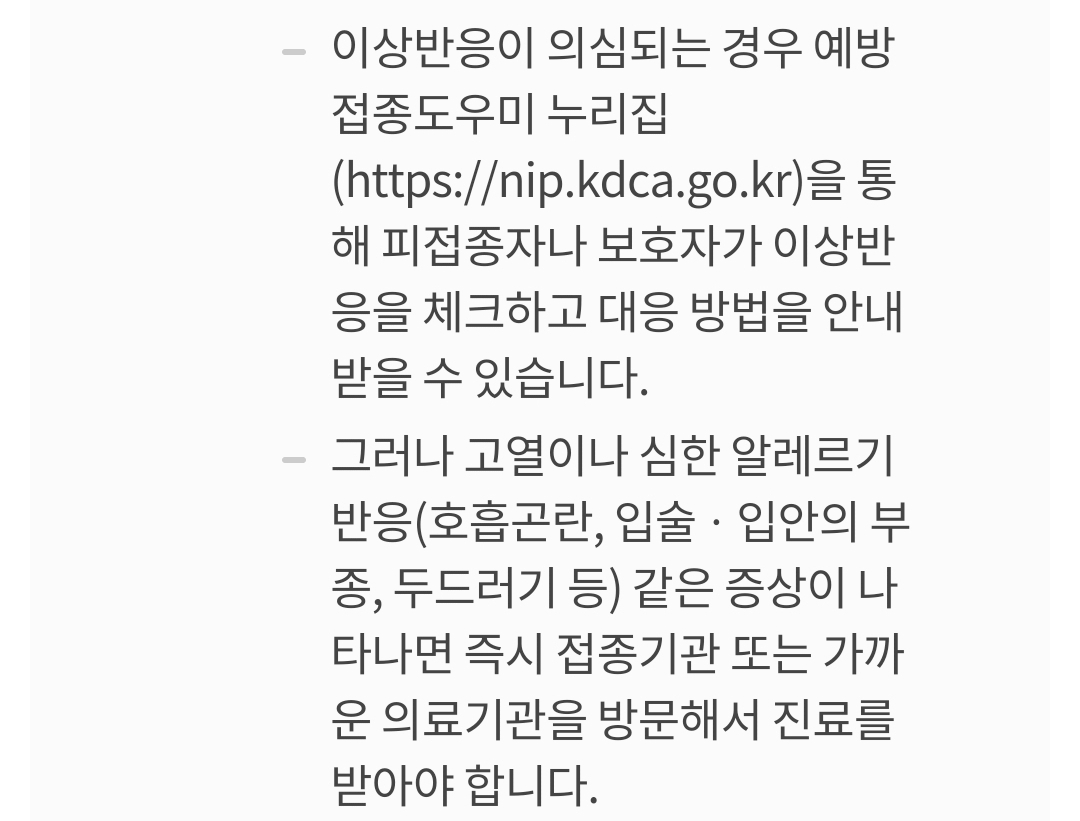ㅡ 열이 너무 많이 나거나 두드러기 등 알러지반응같은 게 생기면, 바로 병원가라!!! 꼭! 중증 부작용은 쇼크, 의식소실, 호흡곤란, 입술이나 구강내 부종 등. 그 외 아나필락시스로 분류되는 것.