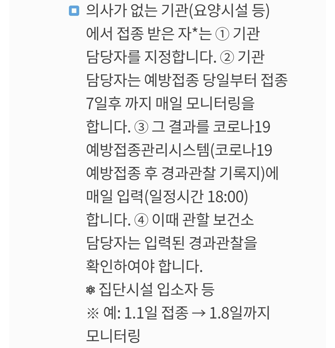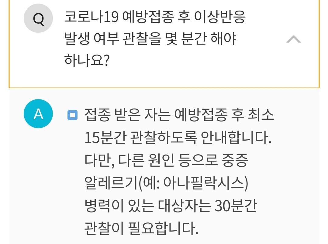 ㅡ 주사맞고 누구나 15분, 병이 있는 사람이면 30분은 현장대기하며 급성 부작용이 있는지 기다려보라.