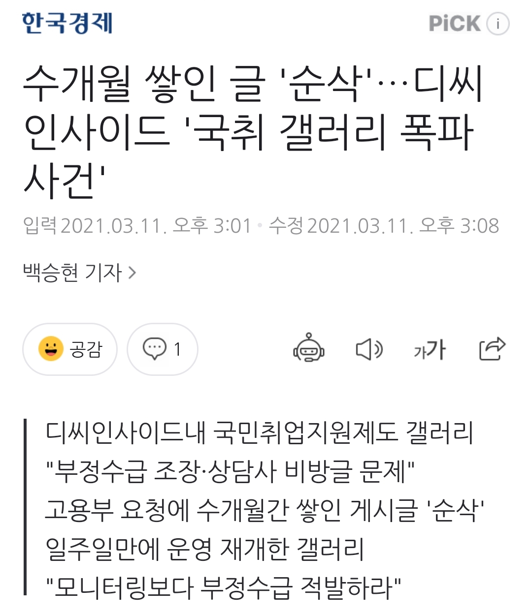 "정부 부처가 특정 온라인 커뮤니티에 이런 조치를 취한 것은 매우 이례적이다. 하지만 그도 그럴 것이 야심차게 출범시킨 국민취업지원제도가 '현금 퍼주기'라는 지적을 받고 있는 마당에 최근에는 청와대 국민청원 게시판에 제도의 허점과 무리한 집행을 비판하는 내부자(상담사)의 폭로글이 올라와 소관부처로서 속을 끓이고 있었기 때문이다. " - 한국경제신문
