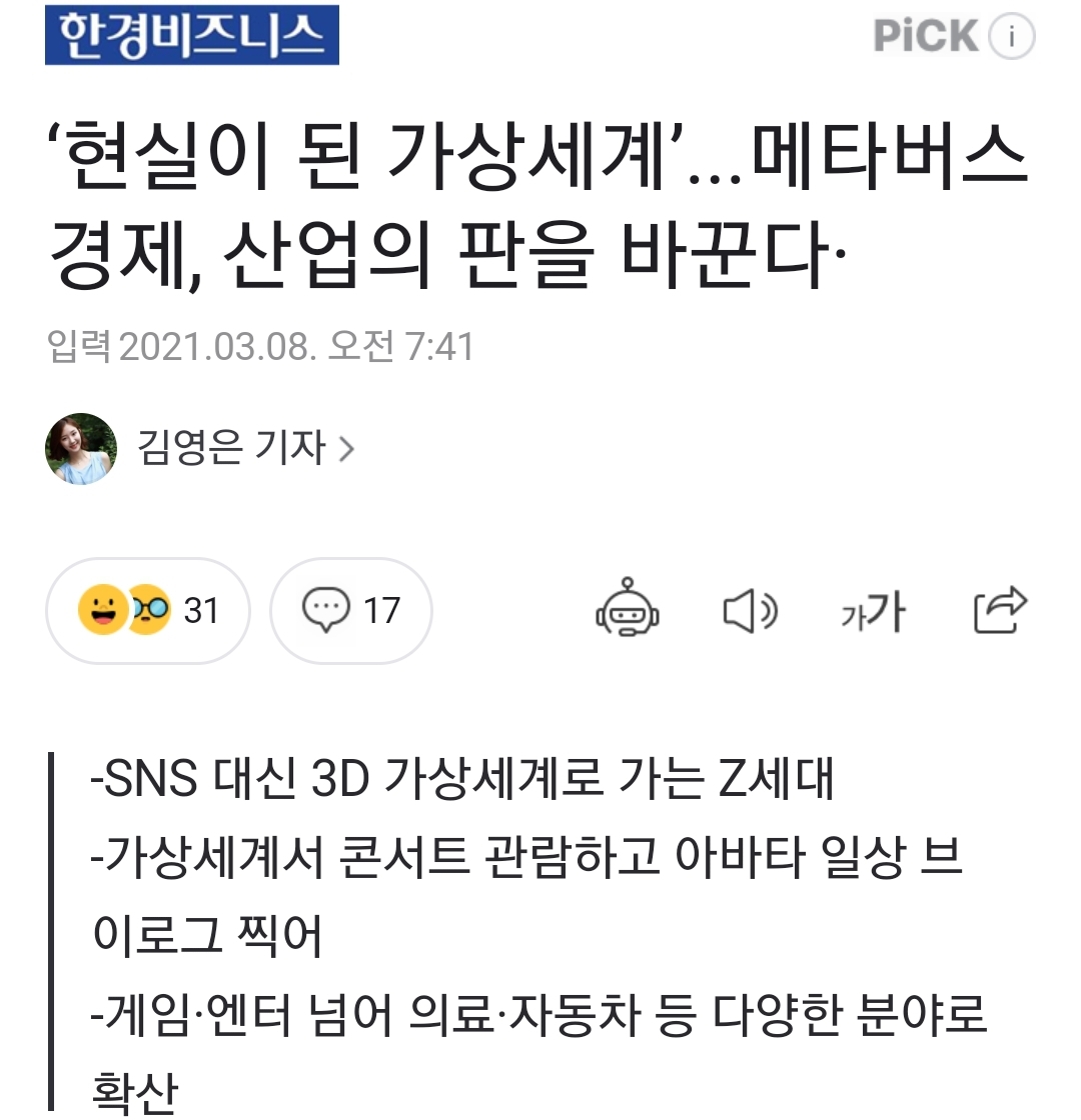 | 메타버스-가상업무공간 기사 (0) | 2021.05.26 |