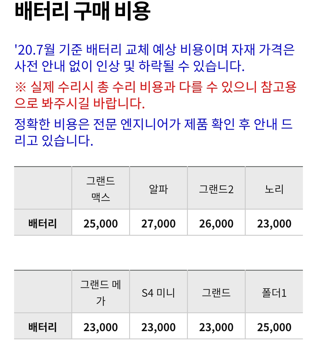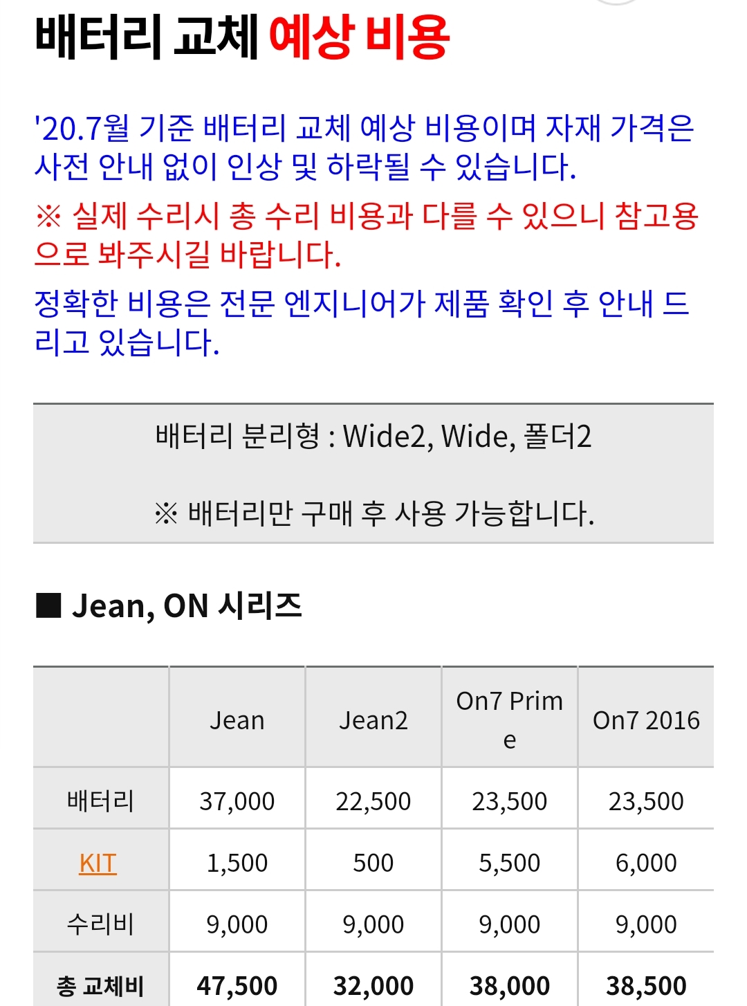 갤럭시 와이드(wide), 온(On), 진(Jean), 폴더(Folder), 그랜드 시리즈, M, 미니, 노리, 알파, 배터리 비용 본문