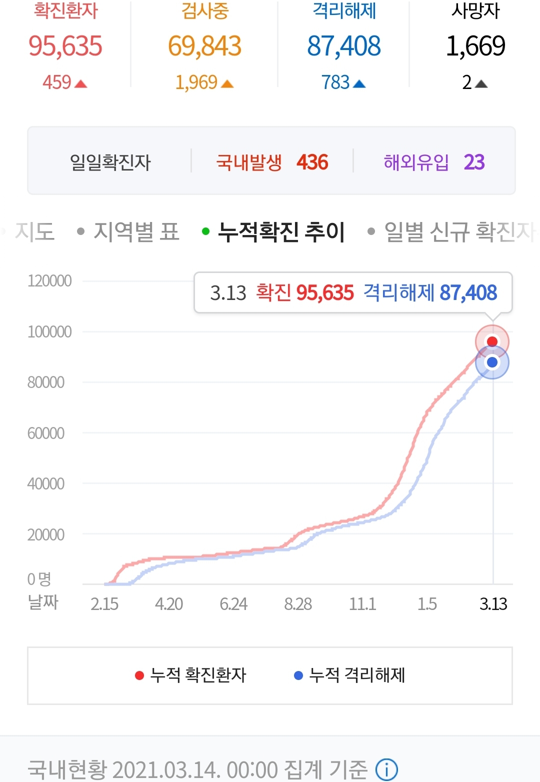 | 코로나19집계(2021.3.13 0:00 기준), 백신 접종 현황, 검사 현황, 사회적 거리두기 변경에 대한 생각 (0) | 2021.03.13 |