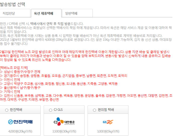 이런 식으로 고를 수 있습니다. 직접전달은 장롱이나 피아노나, 하우스 자재나, 일부 모니터나 TV같은 것.