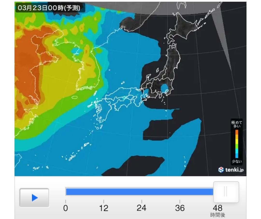 PM2.5予測情報では、健康への影響が懸念されるPM2.5(微小粒子状物質)の分布について、日本気象協会の独自気象予測モデルなどを用いて、現在から48時間先までの傾向を予測しています。