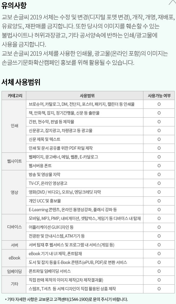- 다만, 기업체 브랜드 로고같은 데는 허용한다는 말이 없으니 그쪽으로 관심있는 사람은 문의해봐야 할 것 같네요. 회사들이 무료배포하는 글꼴은 자체 사용하던 디자인을 풀어놓는 게 있어서, 회사 로고나 그 회사만 쓰는 용도에 겹치지 않도록 그런 조건을 겁니다. 그래서 배달의 민족 글꼴은 가게 간판으로 써도 된다고 명시하기도 하는데 이건 그쪽 얘긴 없으니 그 부분만 주의. [본문으로]