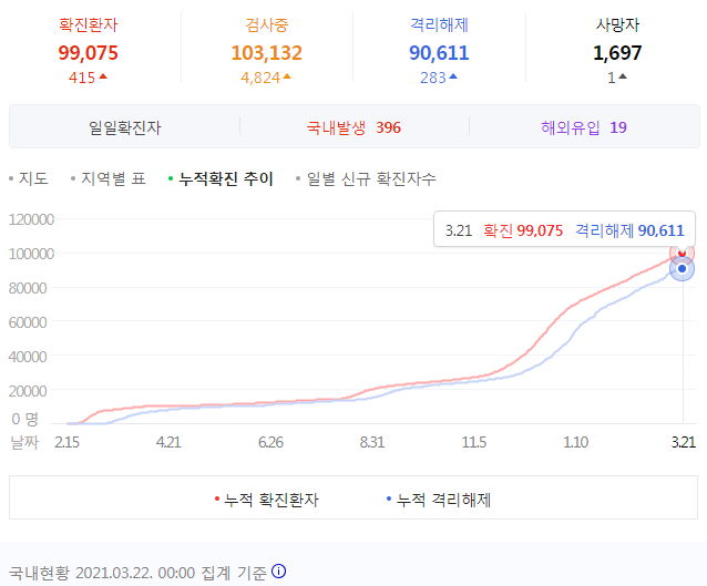 | 코로나19 집계(2021.3.21 0:00 기준) (0) | 2021.03.21 |