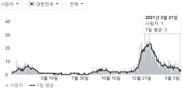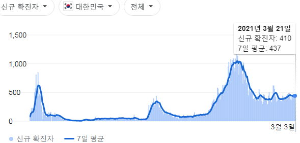 매일 정부 첫 발표는 오전 10시 전후해서 나오고, 그날의 확정발표 보도자료는 오후 2~4시 사이에 나오는 것 같더군요.1 구글 그래프는 미국 날짜가 바뀌는 오후 4~5시 정도에 갱신됩니다.