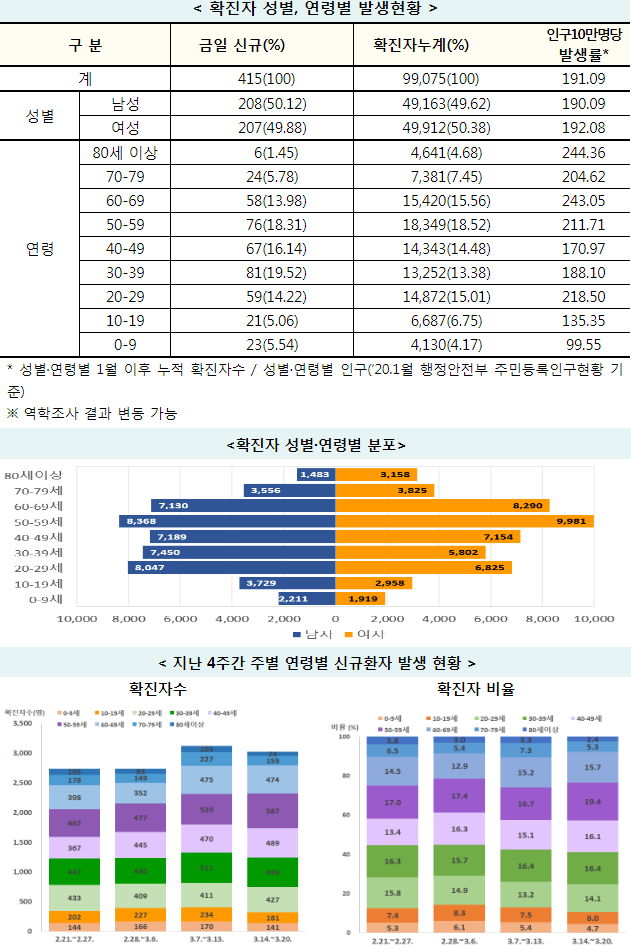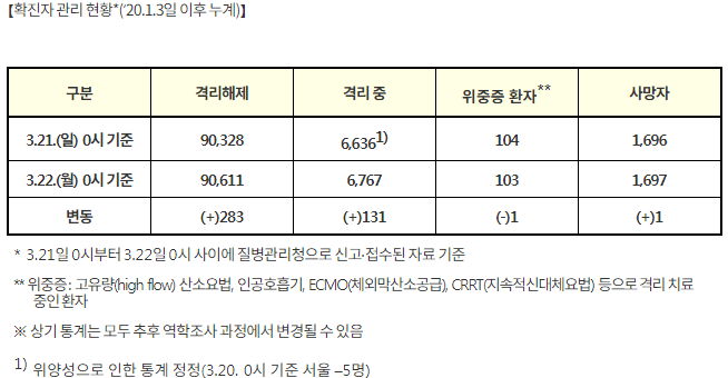 | 코로나19 집계(2021.3.20 0:00 기준) /:/정부발표자료, 그래프 /:/예방접종관련 집계와 안내사항/:/ 수도권과 비수도권 사업장 3월 하순 방역조치표 (0) | 2021.03.20 |