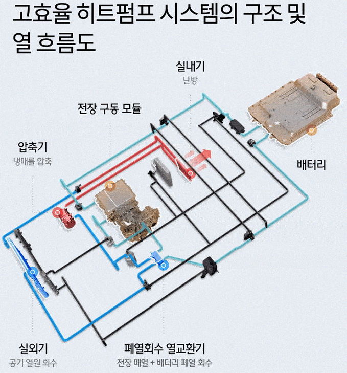 겨울철 배터리팩 보온을 위한 히트펌프. "현대, 기아차에서 발표한 새로운 히트 펌프 시스템의 가장 큰 특징은 버려지는 열을 수집한다는 점이다. 기본적으로 펌프는 배터리에서 에너지를 얻어 열을 발생시키지만, 추가적으로 모터, 인버터 그리고 충전기에서 발생하는 열도 함께 수집한다."
