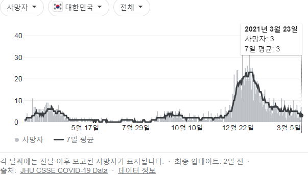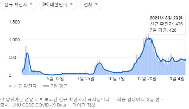 매일 정부 첫 발표는 오전 10시 전후해서 나오고, 그날의 확정발표 보도자료는 오후 2~4시 사이에 나오는 것 같더군요.1 구글 그래프는 미국 날짜가 바뀌는 오후 4~5시 정도에 갱신됩니다.