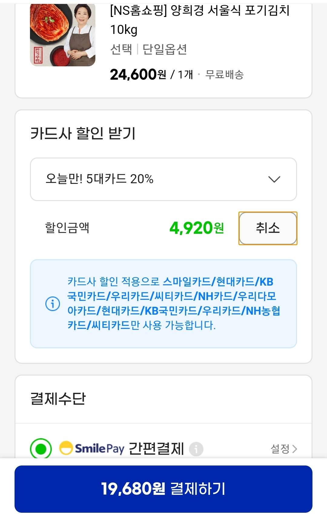 g마켓, 스마일클럽, 금요일쿠폰, 홈쇼핑중복쿠폰, 5대 신용카드 스마일페이결제 할인을 모두 적용한 가격인데, 꽤 싸게 나왔네요. 배추와 고추가루 모두 국산. 저희는 김치가 아직 많이 있어서 구경만 합니다.