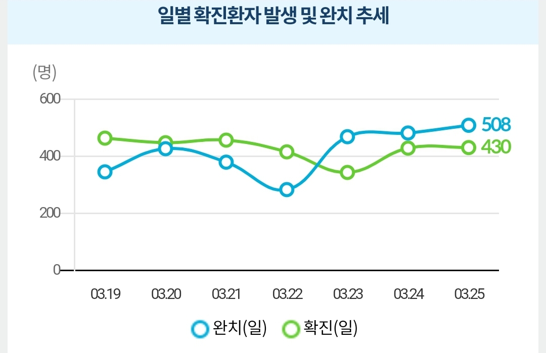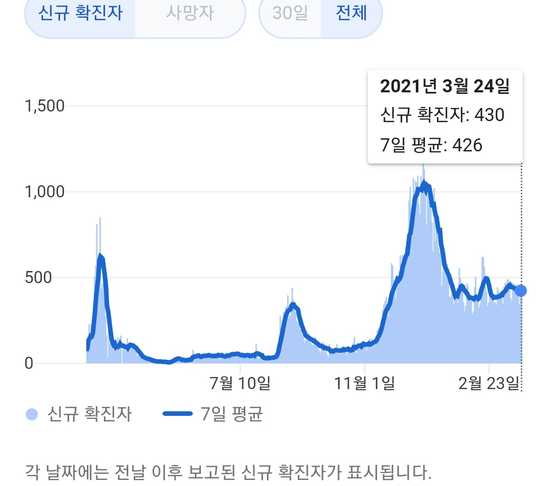 매일 정부 첫 발표는 오전 10시 전후해서 나오고, 그날의 확정발표 보도자료는 오후 2~4시 사이에 나오는 것 같더군요.1 구글 그래프는 미국 날짜가 바뀌는 오후 4~5시 정도에 갱신됩니다.