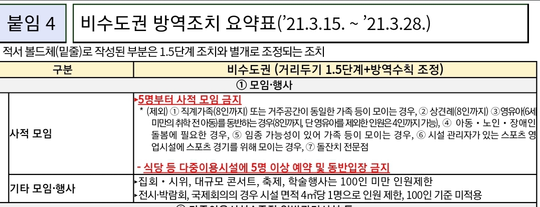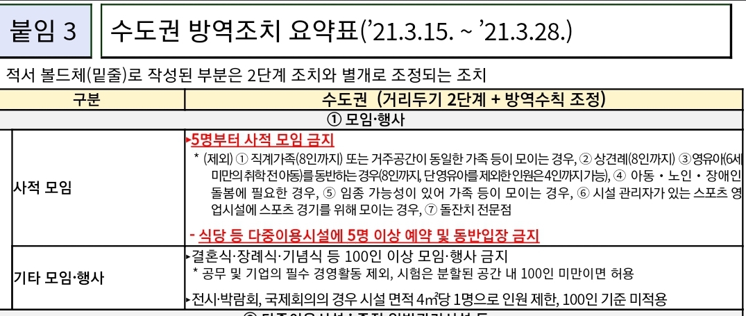 그래도 "상견례도 앙가 합쳐 4인까지만 허용" 운운하던 말도 안 되는 소리는, 8인까지 늘려주는 식으로 약간은 융통성아 생겼군요. 그래도 여전히 빡빡하지만.