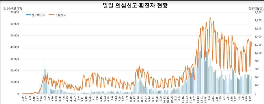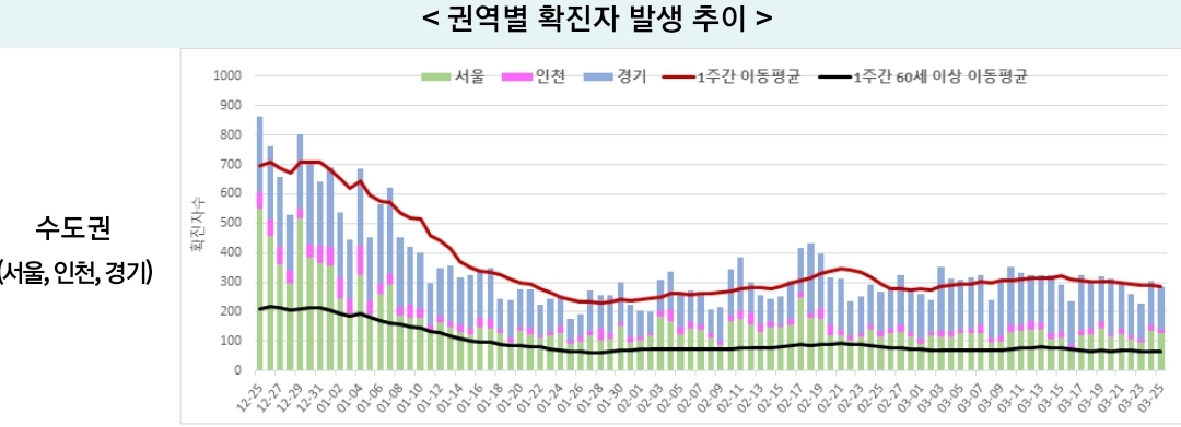 1월달의 기세가 수그러든 뒤로 수도권 추세는 비슷합니다. 그리고 그날 전국 확진자의 2/3정도를 차지하는 것도 비슷합니다.