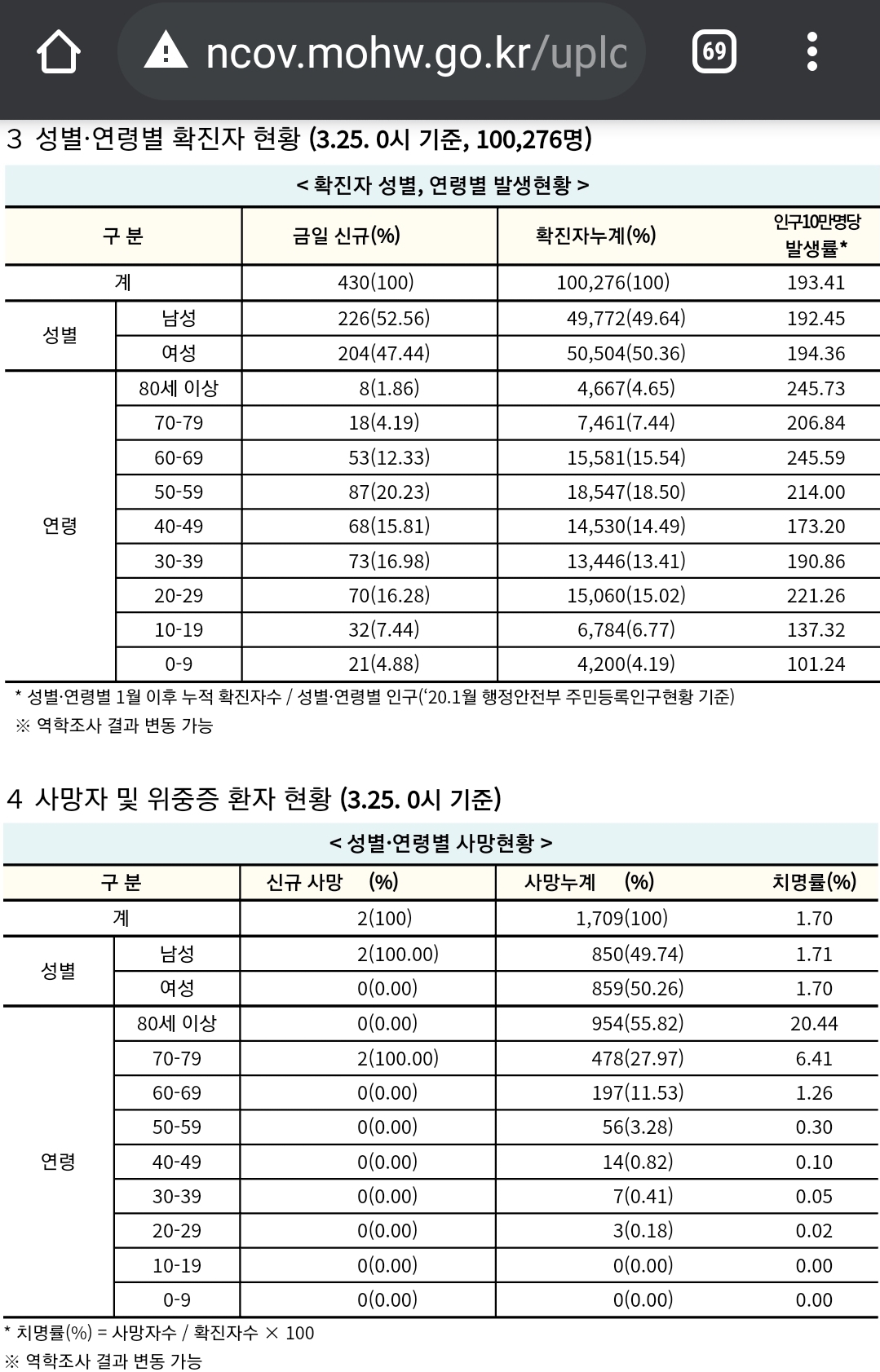성별, 연령별. 발생은 비슷하고 치사율은 연령에 비례합니다.
