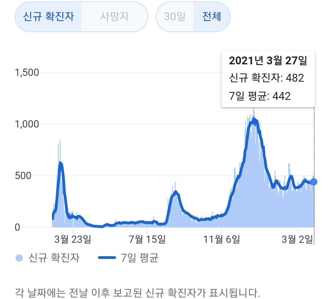 매일 정부 첫 발표는 오전 10시 전후해서 나오고, 그날의 확정발표 보도자료는 오후 2~4시 사이에 나오는 것 같더군요. 구글 그래프는 미국 날짜가 바뀌는 오후 4~5시 정도에 갱신됩니다. 1