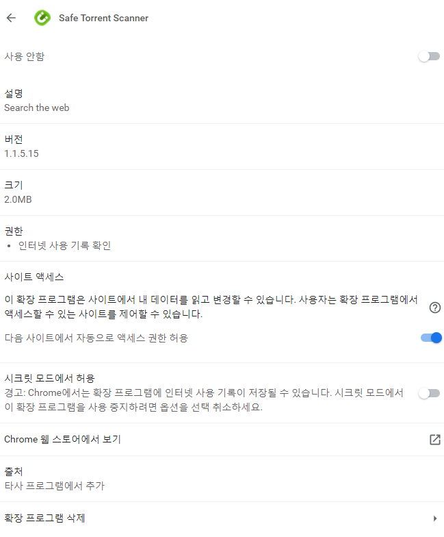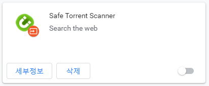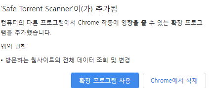 이걸 다 깔고 나면, 웹브라우저에 Safe Torrent Scanner 라는 확장프로그램을 자동으로 추가합니다. 사용하지 않는 상태로 추가되지만, 이 확장프로그램은 uTorrent 실행에 필수적인 프로그램이 아닙니다. 그리고 웹서핑 기록을 추적하고 방문한 웹페이지 데이터를 읽고 변경할 권한을 가집니다. 잘 모르면 안 쓰는 게 낫습니다.