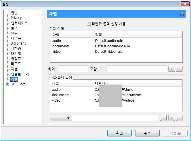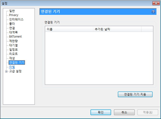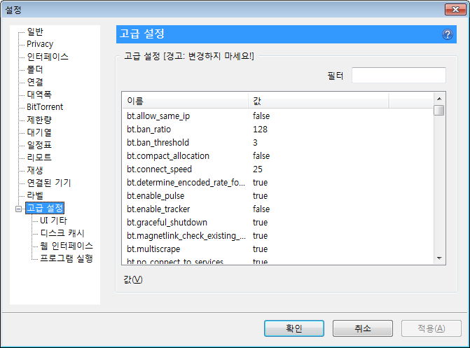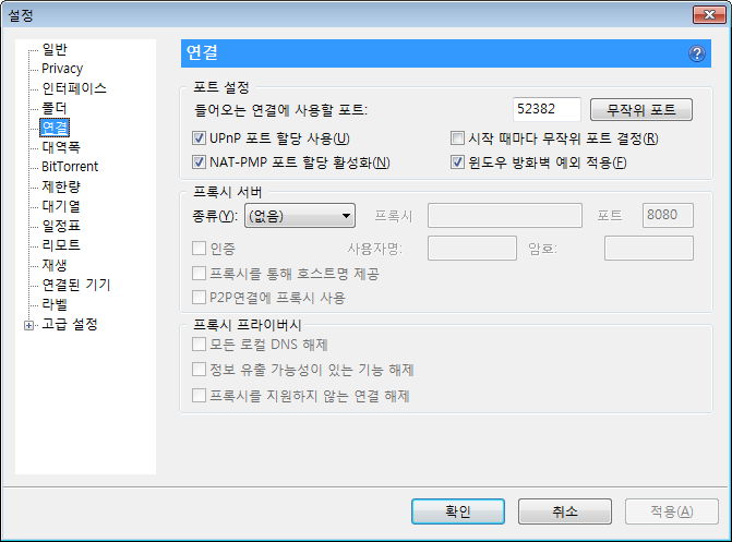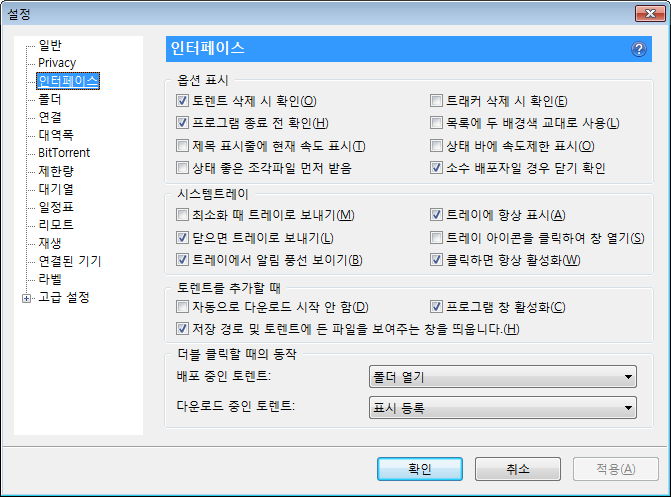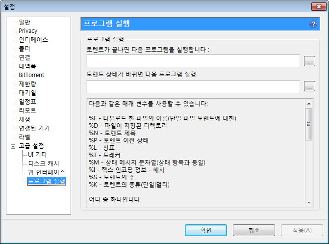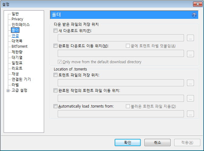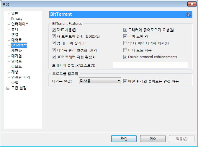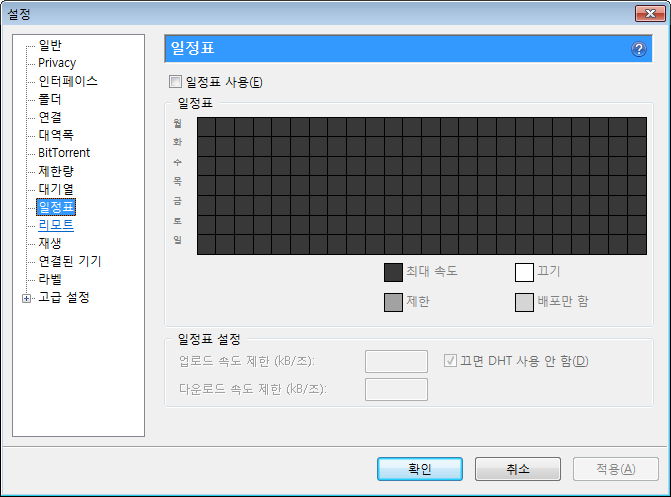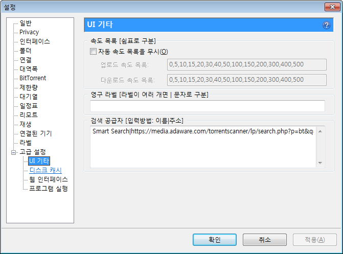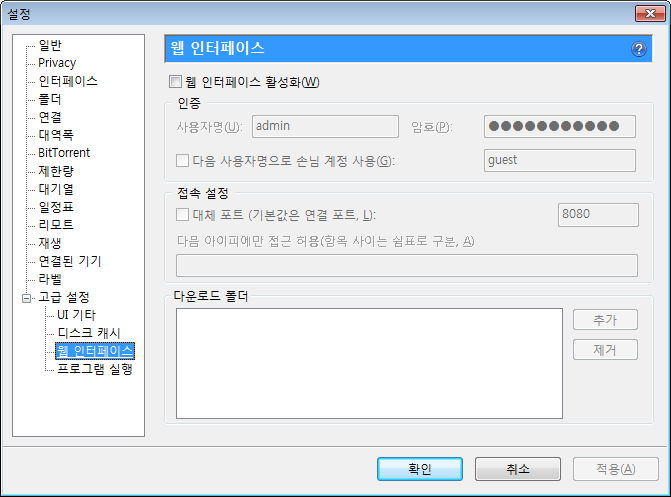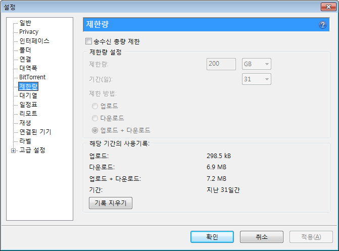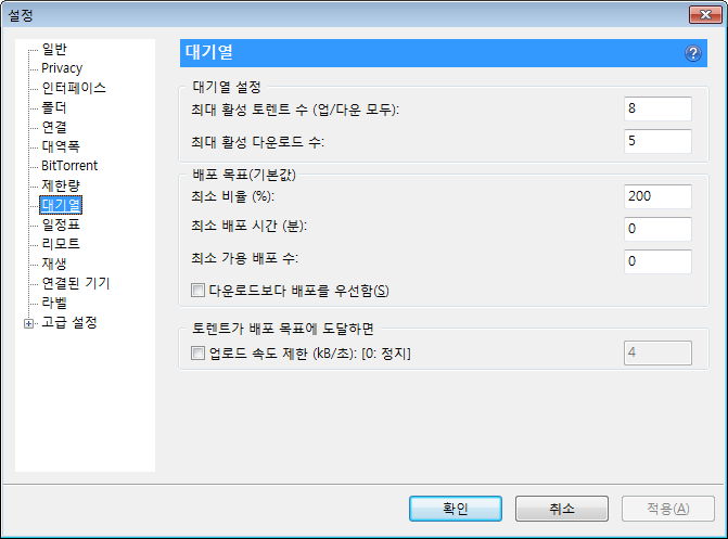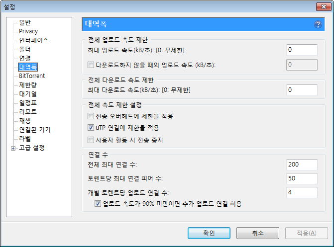 제한량, 그리고 최대 활성 토렌트 수 등. 사용하는 회선이나 주위 환경을 생각해 필요하면 지정해줍니다.