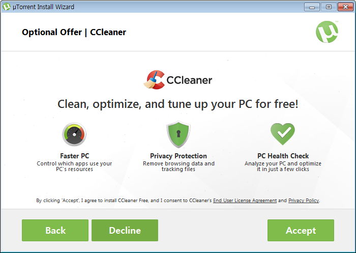 제휴프로그램-2. Decline 이 CCleaner를 설치하지 않고 uTorrent를 설치하는 버튼.