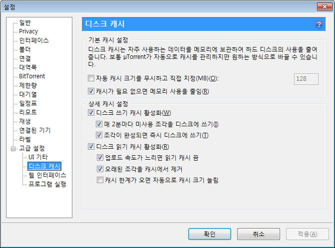 디스크 캐시 설정.