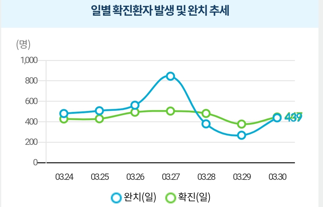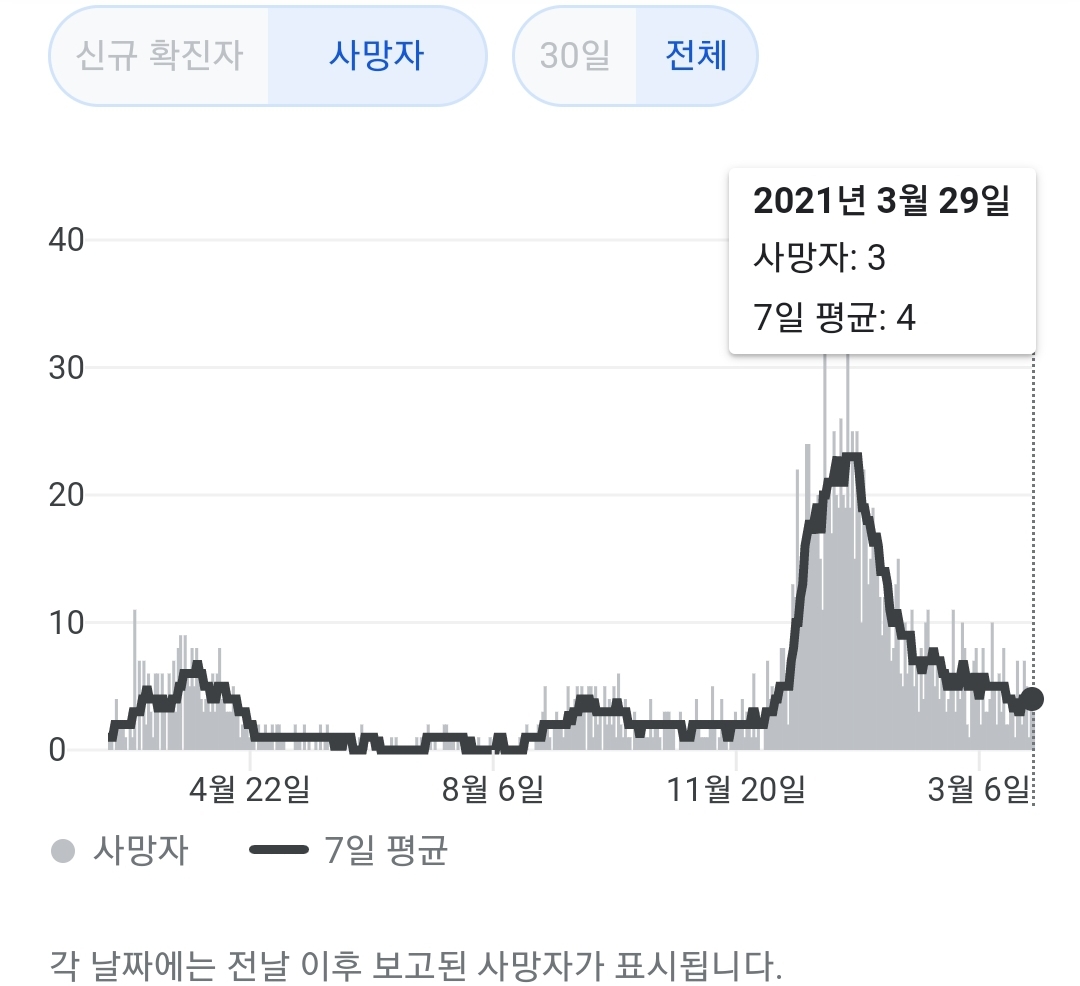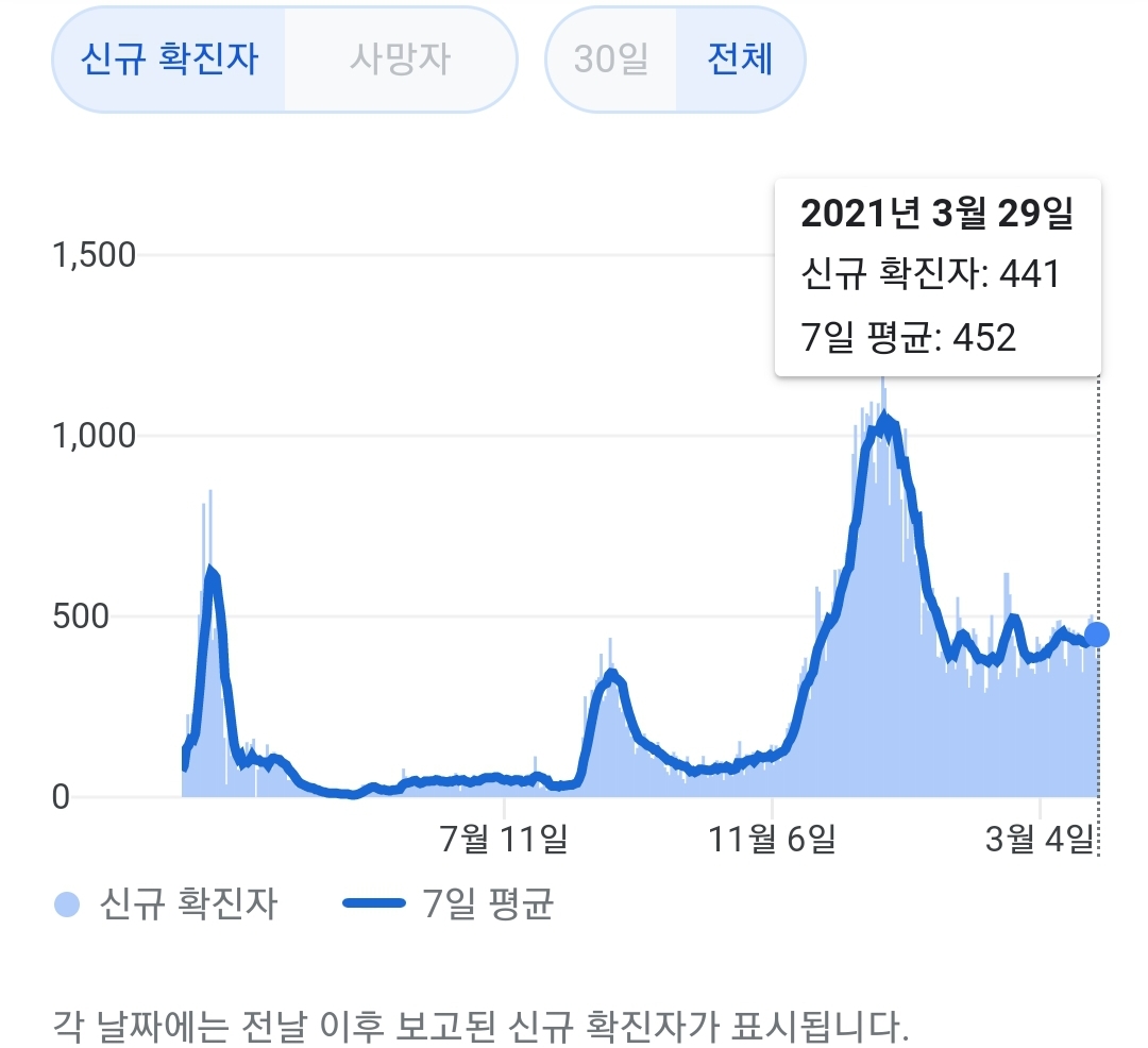 매일 정부 첫 발표는 오전 10시 전후해서 나오고, 그날의 확정발표 보도자료는 오후 2~4시 사이에 나오는 것 같더군요.1 구글 그래프는 미국 날짜가 바뀌는 오후 4~5시 정도에 갱신됩니다.