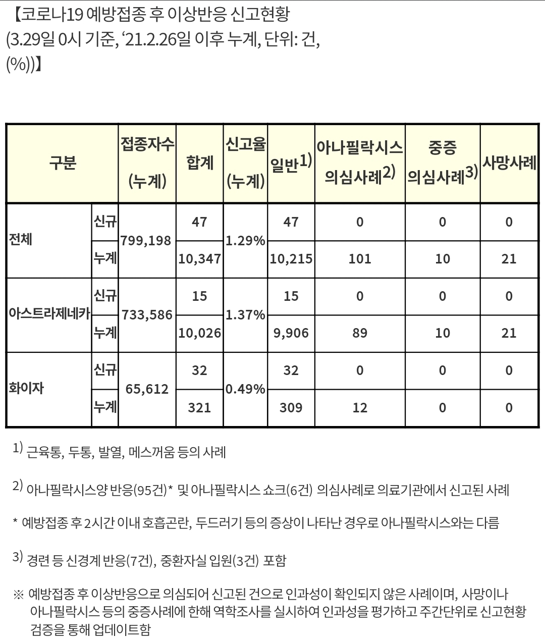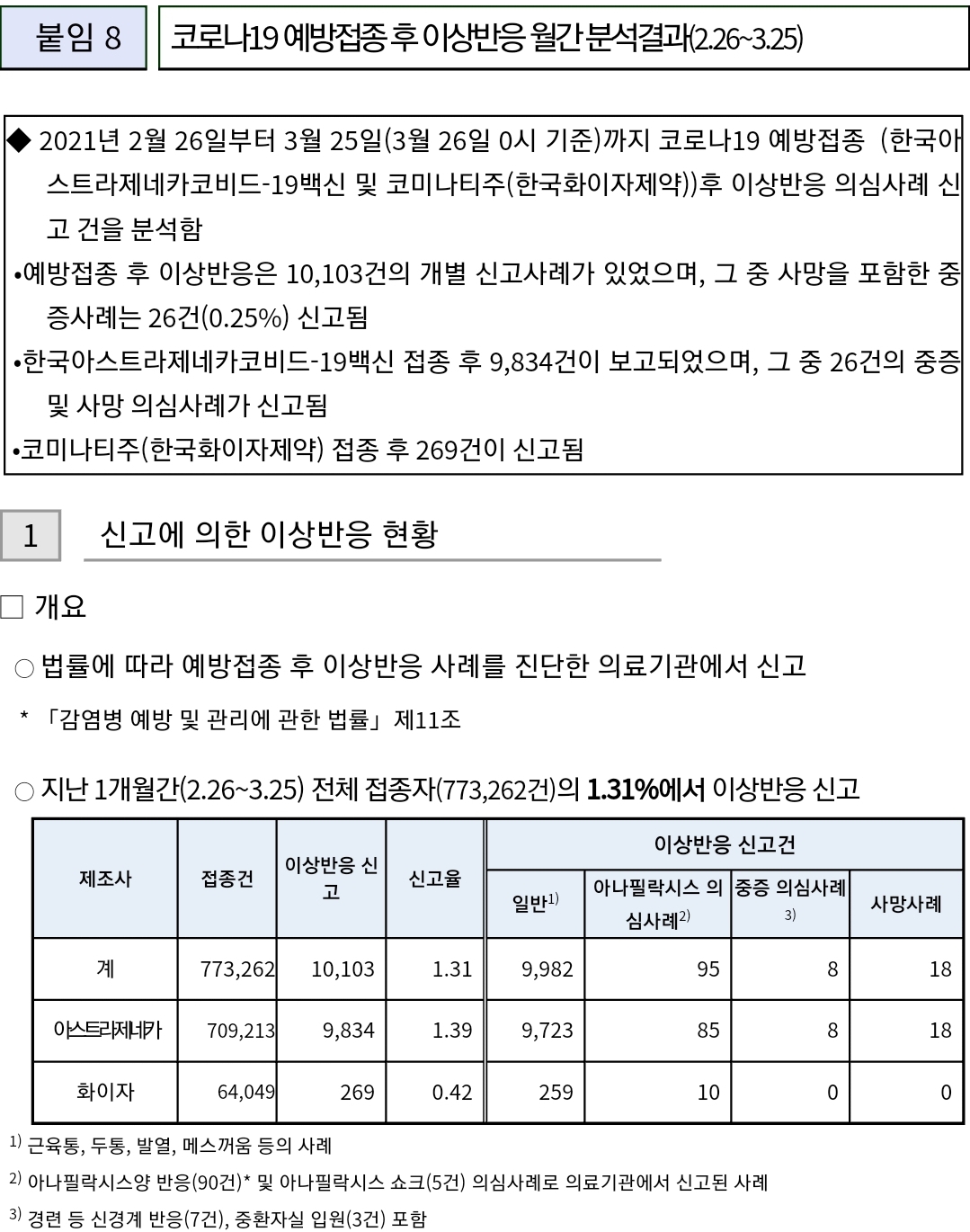 붙임자료를 보면, 다른 나라들의 통계가 첨부돼 있는데, 거길 봐도 화이자백신에 비해 아스트라제네카(AZ) 백신을 맞은 사람들이 훨씬 많이 이상증상을 신고했다. 이는 몸에 무해하다고는 해도 일단은 이물질 즉 항원으로 인식되는 아데노바이러스벡터에 대한 반응일 가능성. 하지만 현재로서는 "몸조심해가며 병원방문할 걸 생각하더라도 맞는 게 개인생존과 공중보건 양자에 모두 이득"이라는 게 각국 보건당국의 판단.1
