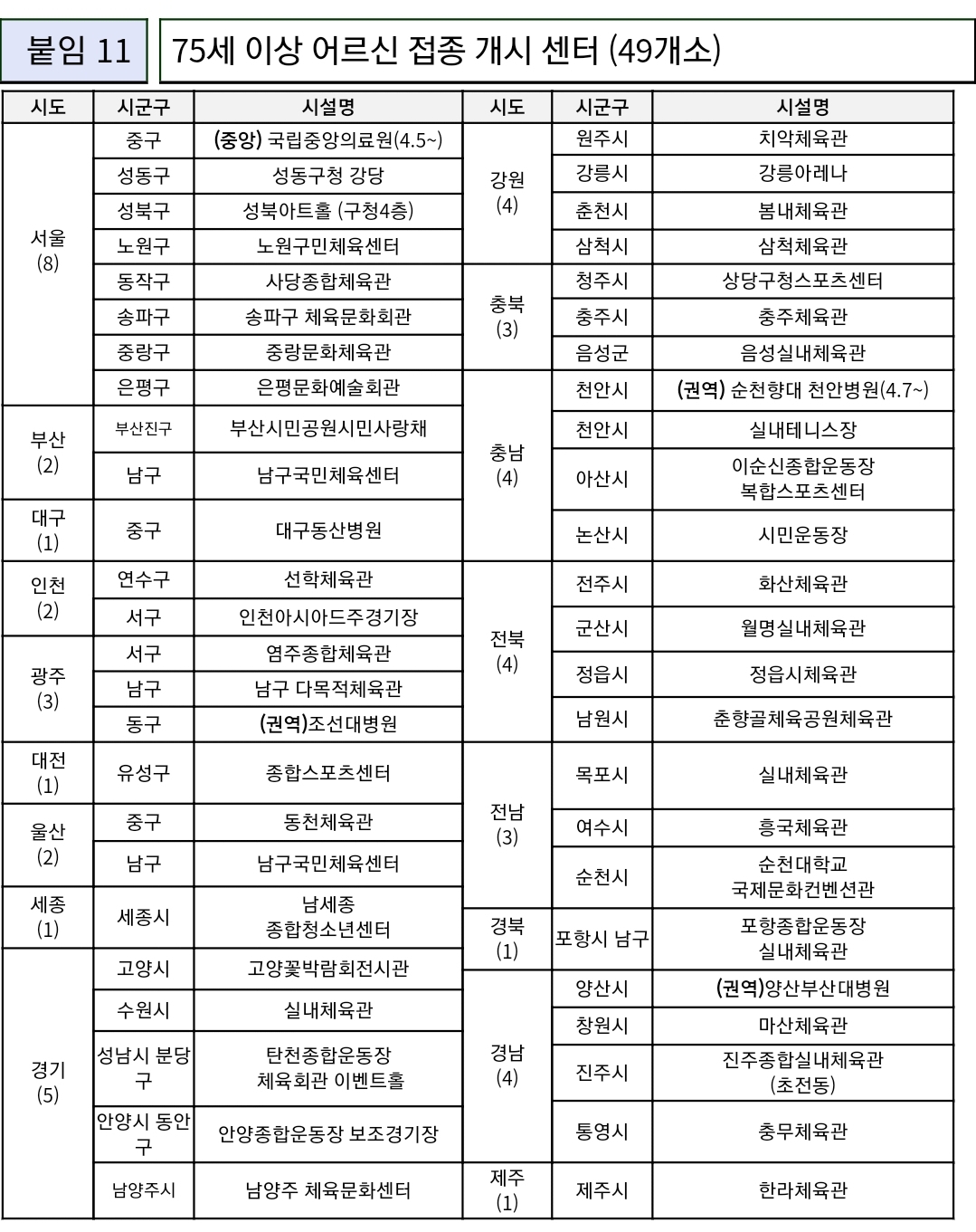 75세 이상 어르신 접종 개시 센터(전국 49개소)
