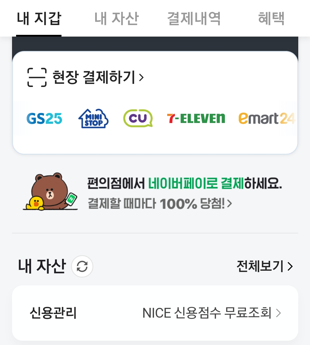 네이버 앱을 실행하면 검색화면 상단에 보이는, 네이버페이 이이콘을 터치해 들어가면 보입니다.