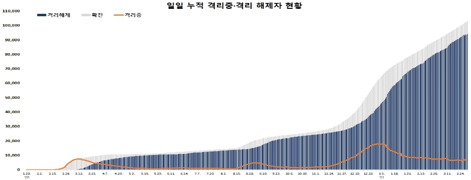 회색이 누적확진, 남색이 누적격리해제, 주황색선이 그날의 환자수.