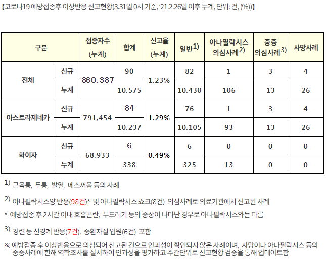 코로나19 백신 접종 후 이상반응 중 아나필락시스 사례 1건과 중증 이상반응 1건이 백신과 인과성이 있다고 인정됐다. 이로써 국내에서 백신과 접종 후 이상반응이 인과성이 있다고 인정된 사례