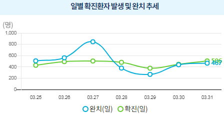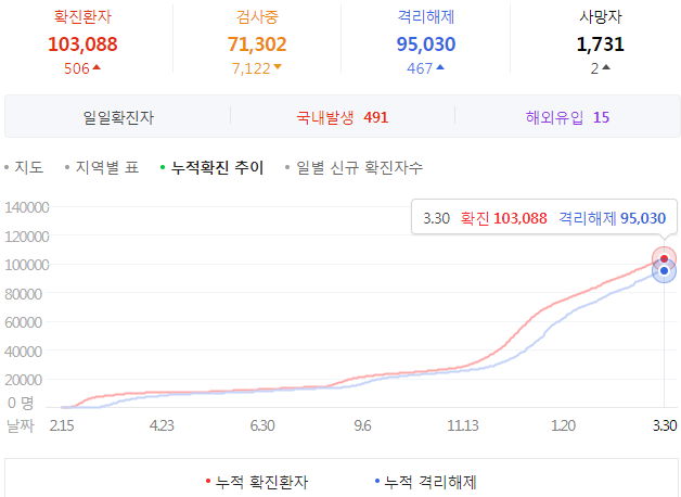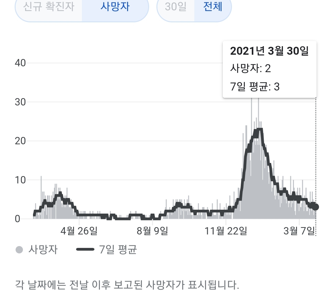 매일 정부 첫 발표는 오전 10시 전후해서 나오고, 그날의 확정발표 보도자료는 오후 2~4시 사이에 나오는 것 같더군요.1 구글 그래프는 미국 날짜가 바뀌는 오후 4~5시 정도에 갱신됩니다.