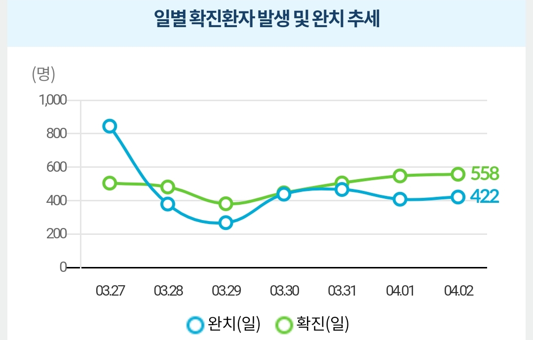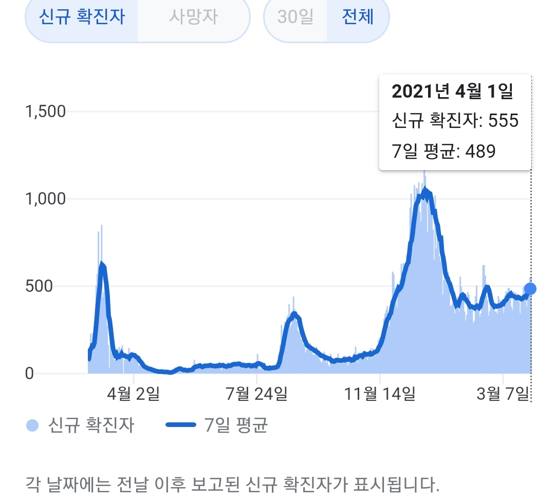 매일 정부 첫 발표는 오전 10시 전후해서 나오고, 그날의 확정발표 보도자료는 오후 2~4시 사이에 나오는 것 같더군요.1 구글 그래프는 미국 날짜가 바뀌는 오후 4~5시 정도에 갱신됩니다.
