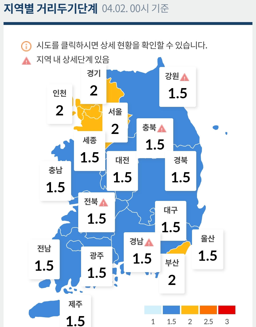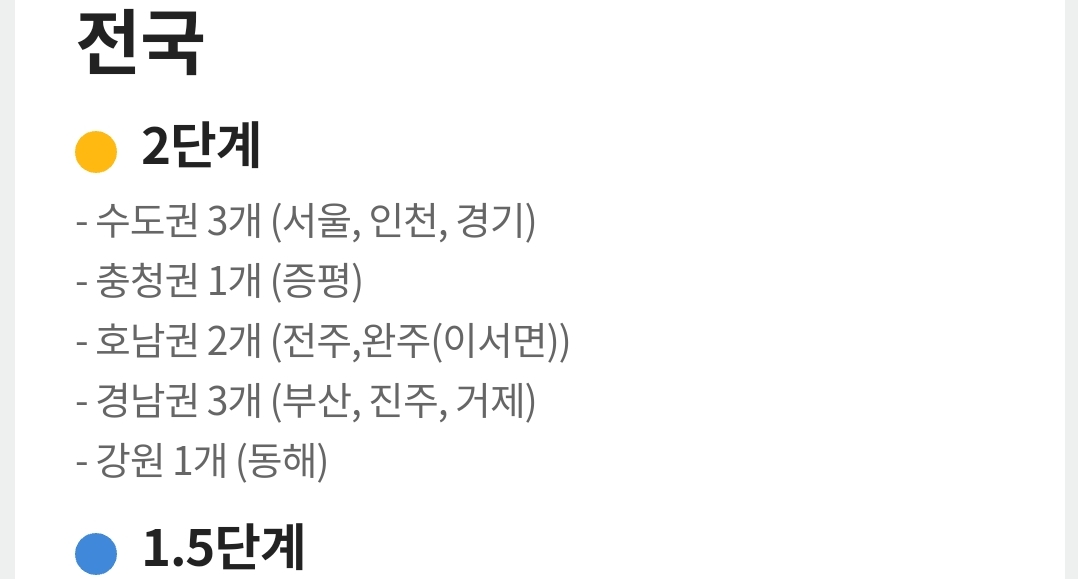 부산이 2단계. 경남, 전북, 충북, 강원 일부 지역도 2단계